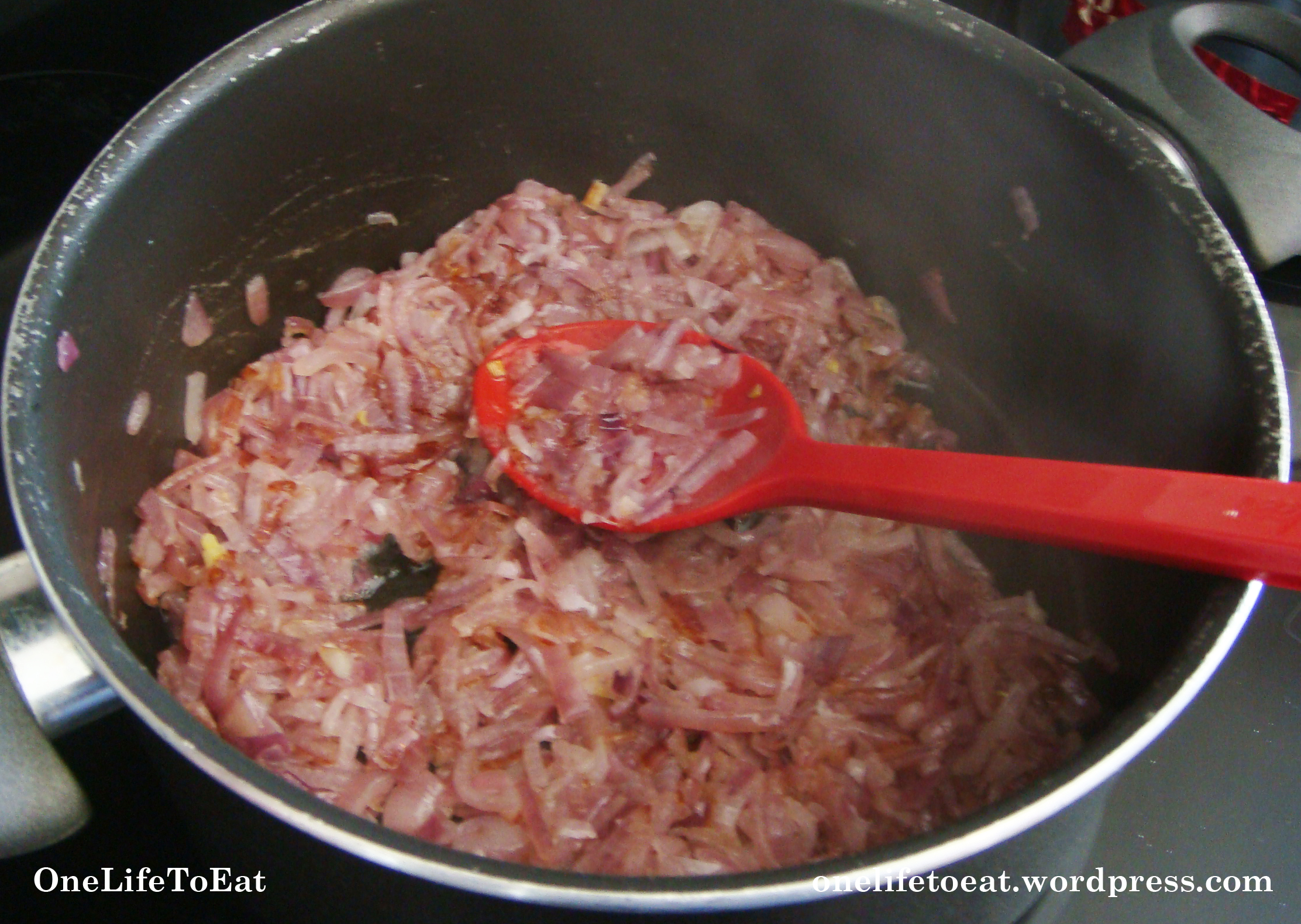 - When well heated, fry the roughly chopped onions on medium heat, till they are light brown in color