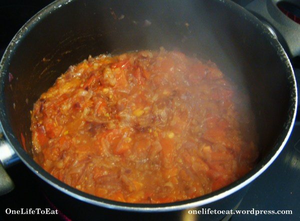 - When the tomatoes are soft and well incorporated with the onions, turn off the heat, and empty the contents of the pot in a food processor
