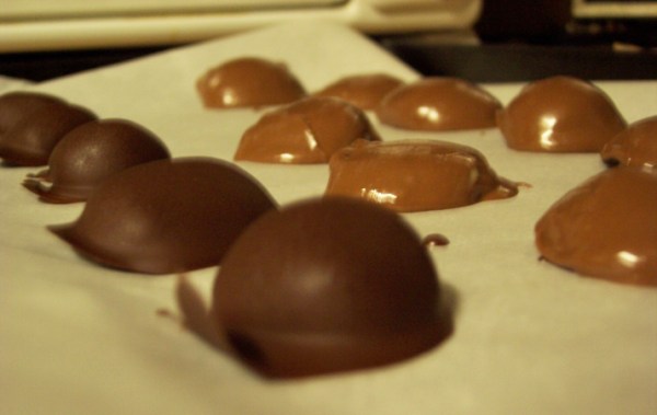 7.       Remove the spheres from the freezer.  Take one from the sheet, drop into the bowl of melted chocolate, and, using a spoon, cover the sphere with chocolate.  As soon as it is coated, take the spoon and quickly fish out the chocolate-covered sphere and return it to the tray.  Continue this process until all spheres are coated.  You may notice that the chocolate has already begun to harden.  Return the tray to the refrigerator for an extra 10-15 minutes to speed up the process.  Overall hardness and texture will depend on what kind of chocolate you used.