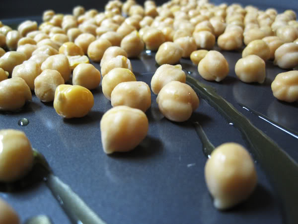 3. Drizzle some olive oil on the chickpeas and toss them around on the baking sheet so that they are coated evenly with the oil.