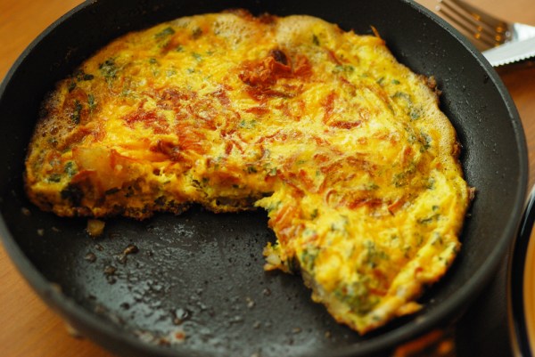 • When the potatoes are well browned and crisp from both sides, pour the egg mixture over the potatoes. Immediately, shake the skillet gently to make sure the egg settles between the potatoes and to the bottom of the skillet. Lower the heat, cover the skillet and allow the eggs to cook slowly. Occasionally, keep shaking the skillet to make sure the eggs don’t stick to the bottom of the skillet.