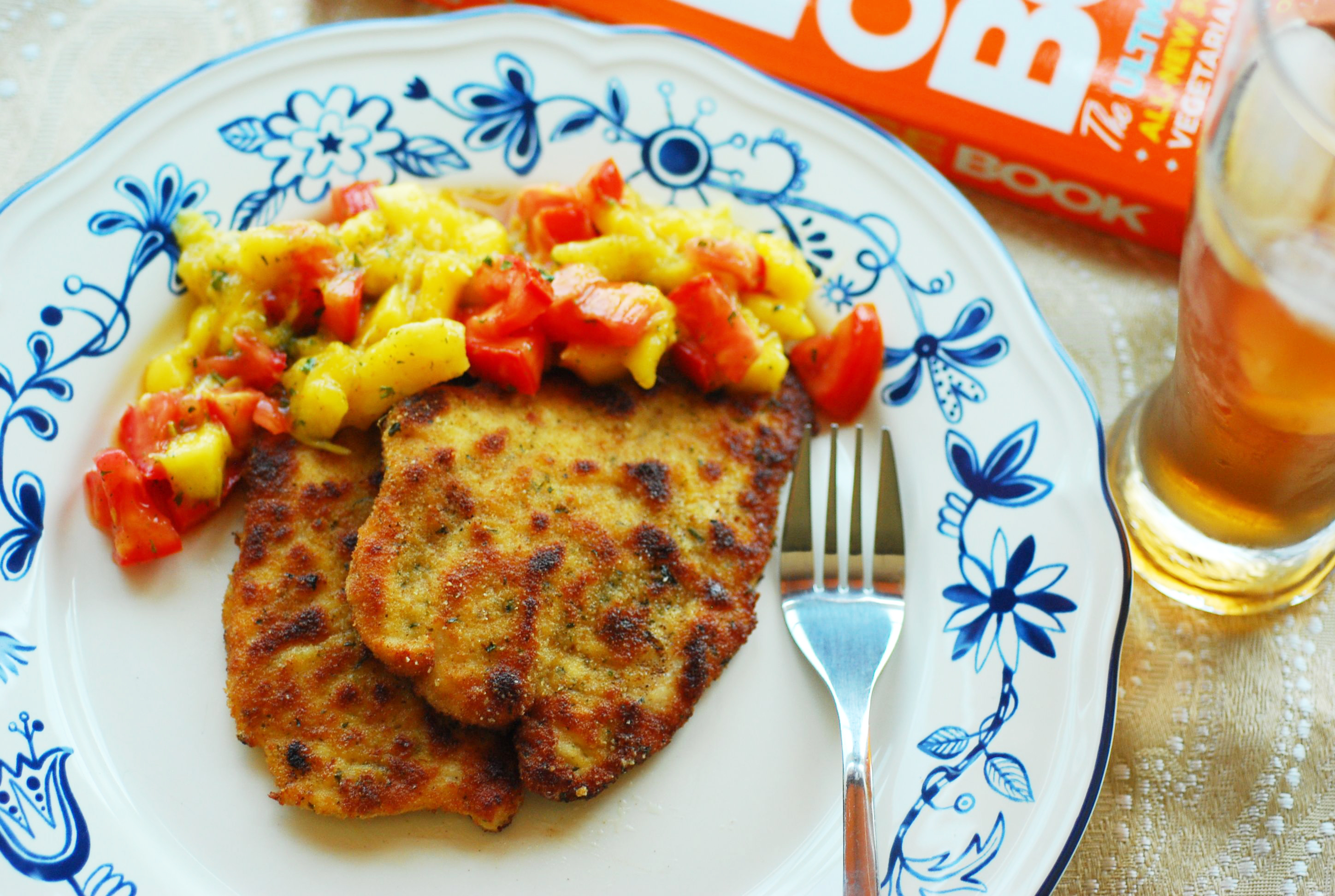 Honestly, the funnest part was pounding the chicken flat ๐ The dish was incredibly easy to put together. I love the combination of sweet, sour and spicy flavors and added some lemon juice and a pinch of chili powder to the sweet mango and tomato ‘salsa’. I also skipped the Parmigiano Reggiano in the breading, and instead used garlic-flavored breading. Needless to say, I had a hard time photographing the final dish as I couldn’t wait to dig in a gobble it all up quickly. My husband only got a small bite ๐
