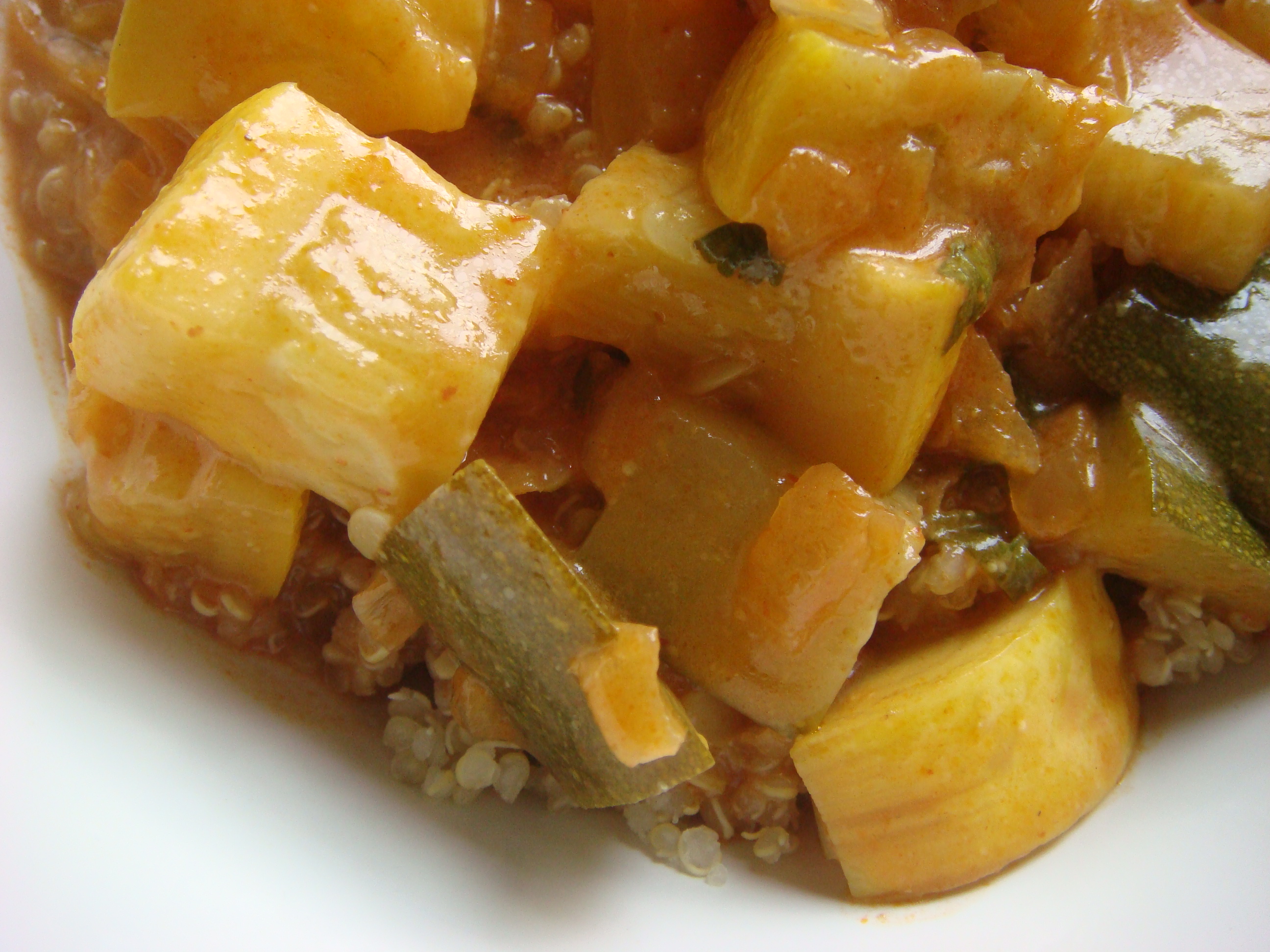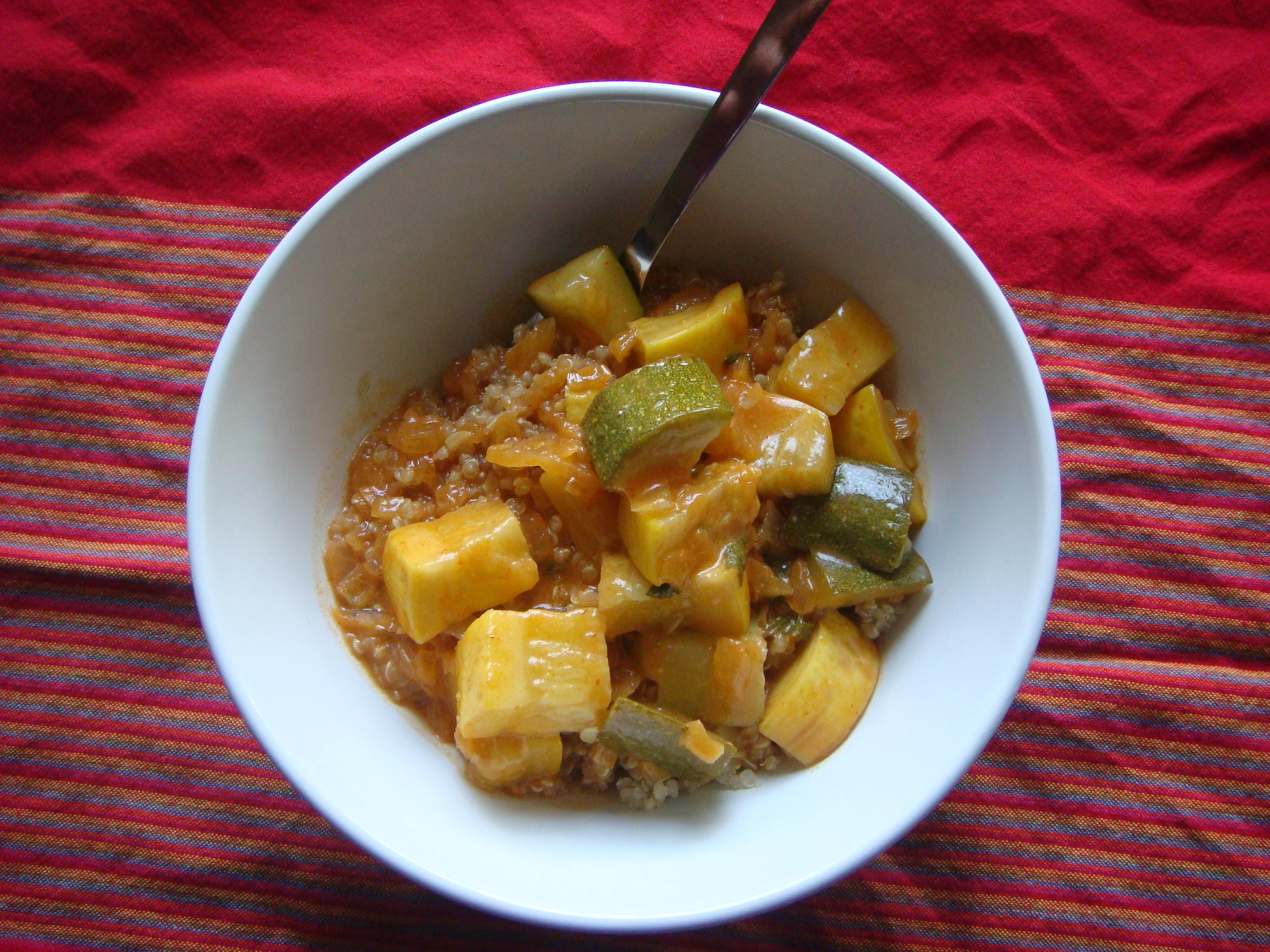 Cube up some assorted veggies you can find in your fridge. I had some zucchini and yellow squash in mine. If I had some, I’d also include carrots, broccoli, and sugar-snap peas. Then, finely chop up some onion, sautee on medium heat with some olive oil until translucent, add in a dollop of tomato paste, mix, spice, mix, add the veggies, stir, add a can of coconut milk, simmer for a bit, and… DONE! I garnished the curry with some chopped cilantro but you could add parsley or chopped thai basil too.I also cooked up some quinoa in the rice cooker to go with it, but basmati or jasmine rice would go beautifully too.