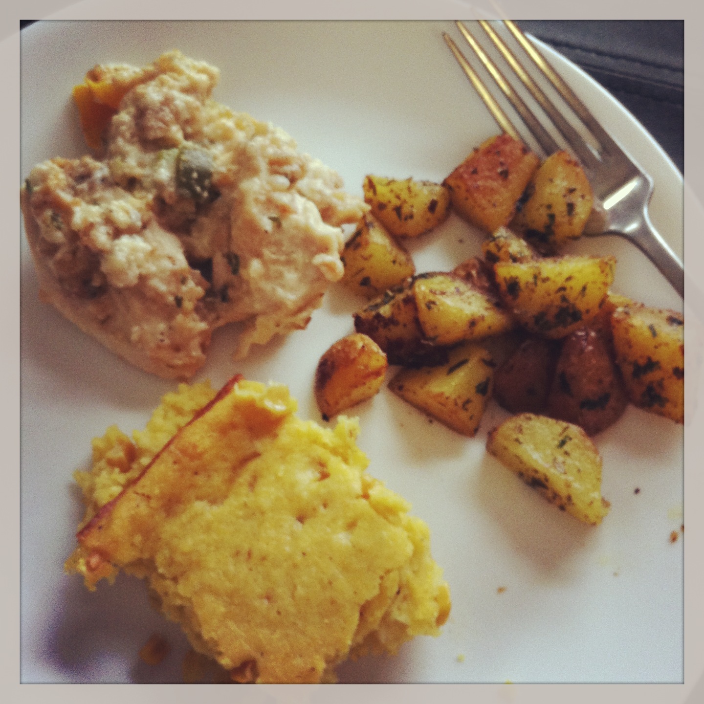 All I could think of when I ate dinner was YUM. If you have friends coming over this weekend and want to make them an easy, comforting meal, serve this up. The meal pictured above consists of baked chicken and creamed corn, served with a side of baked, crispy potatoes.