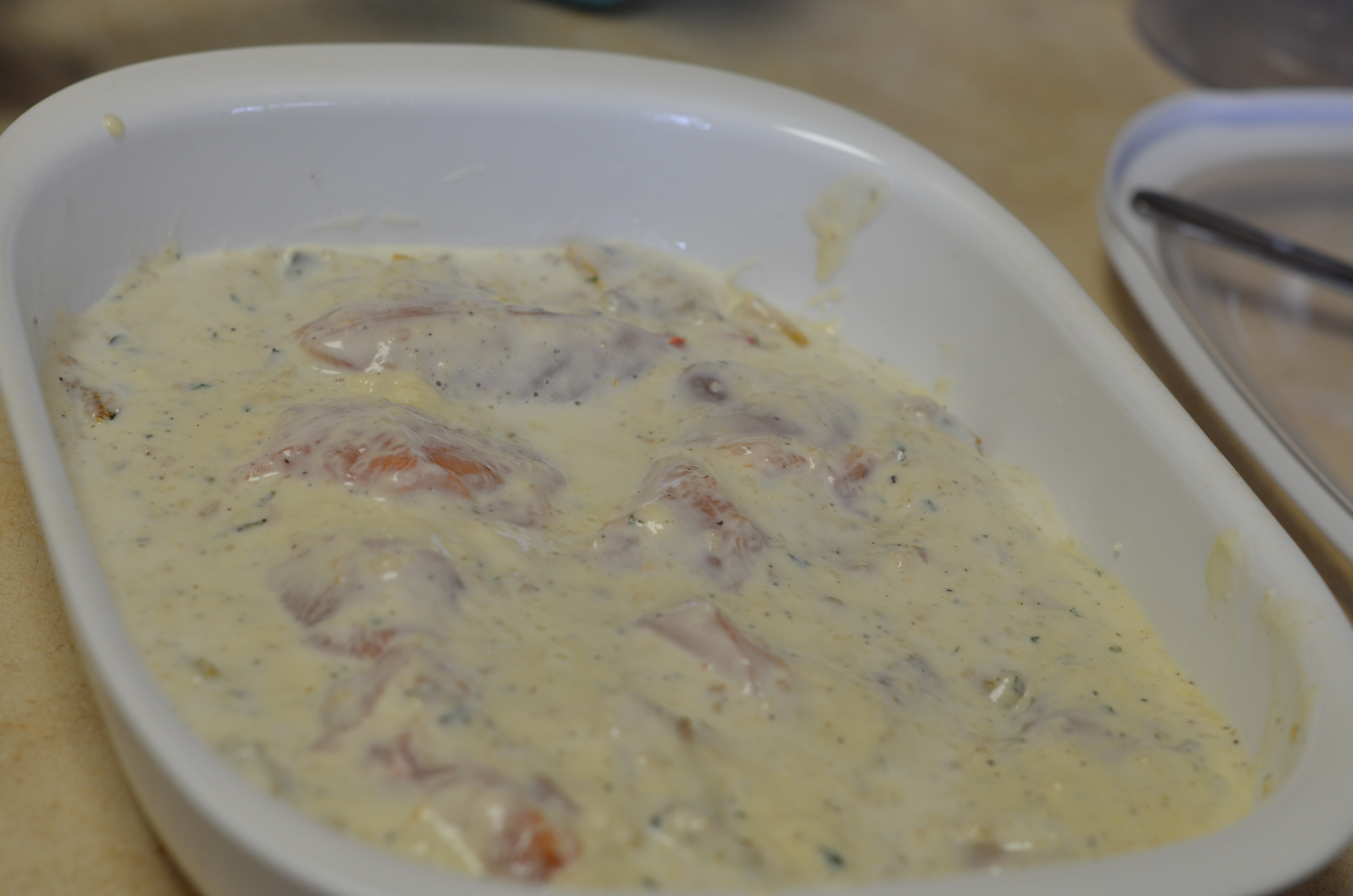 - 4 boneless skinless Chicken breasts, washed, dried and cut in 3-4 pieces each