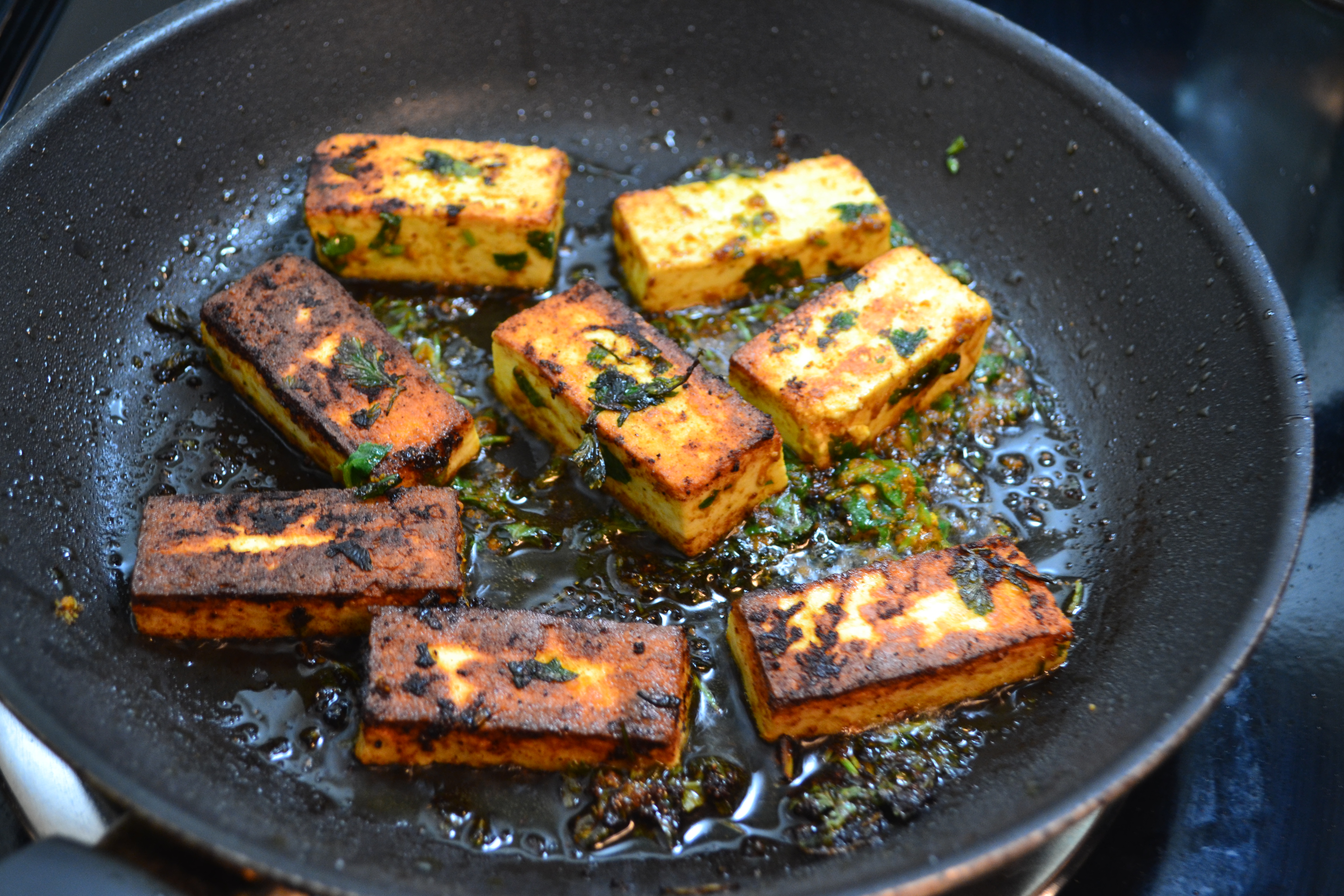 – In a grilling pan or a frying pan, heat the oil. Add the paneer pieces one by one