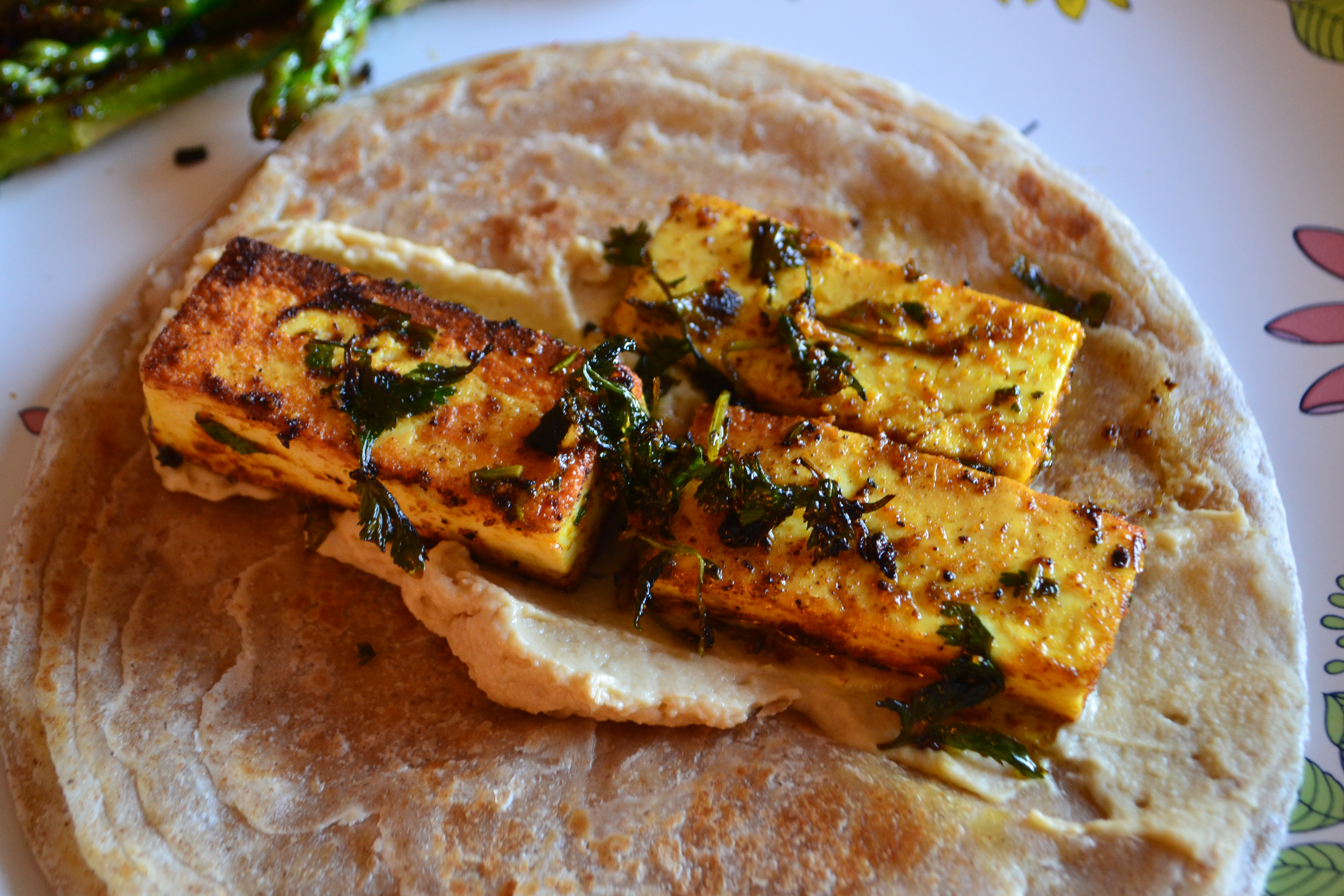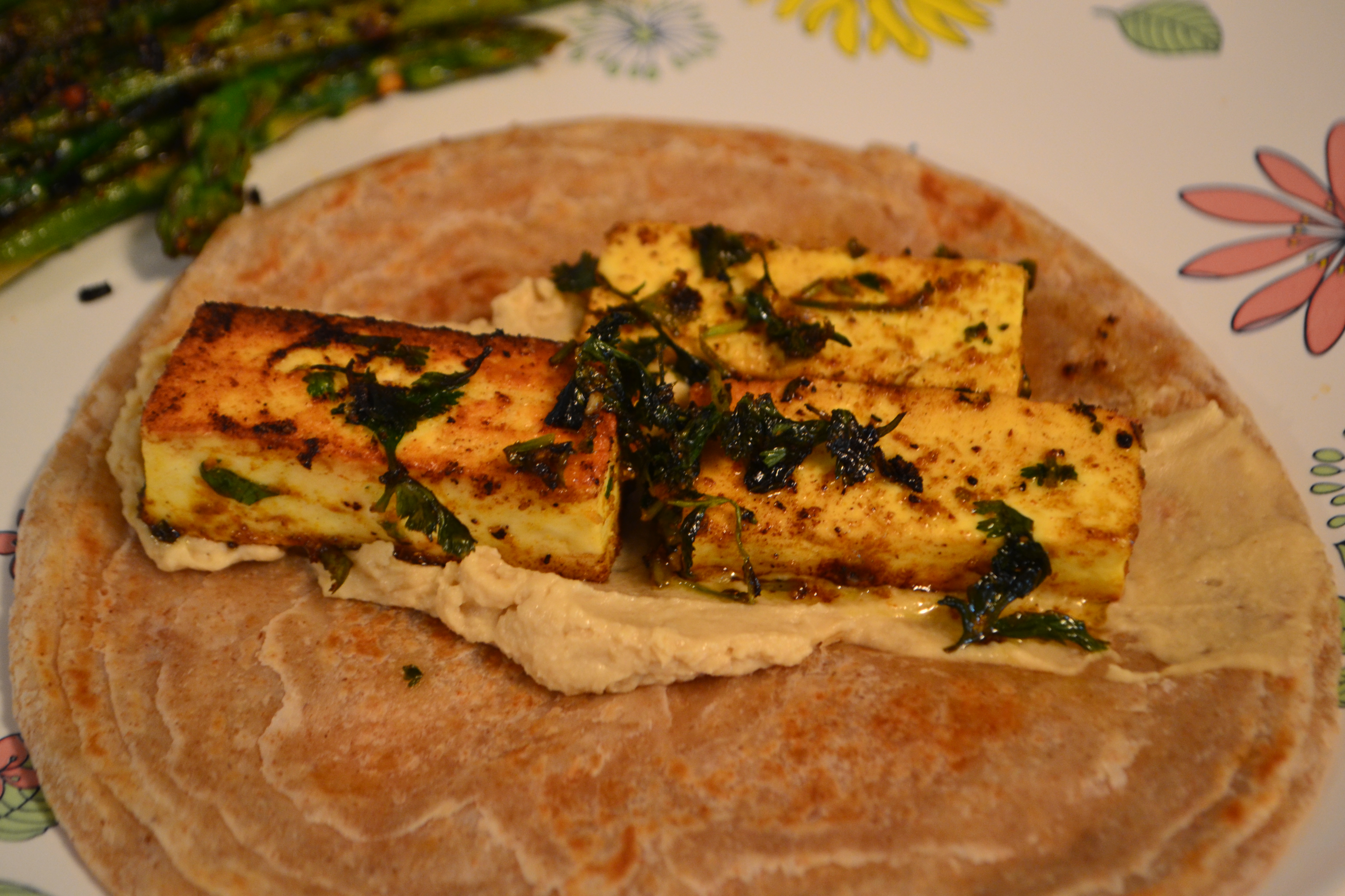 – Heat the flatbread in the mean time. When cooked, spread a dollop of hummus across in the middle. Place the hot paneer pieces. Roll the flatbread, and eat! You could add a cup of plain greek yogurt, or some grilled veggies on the side of your meal.