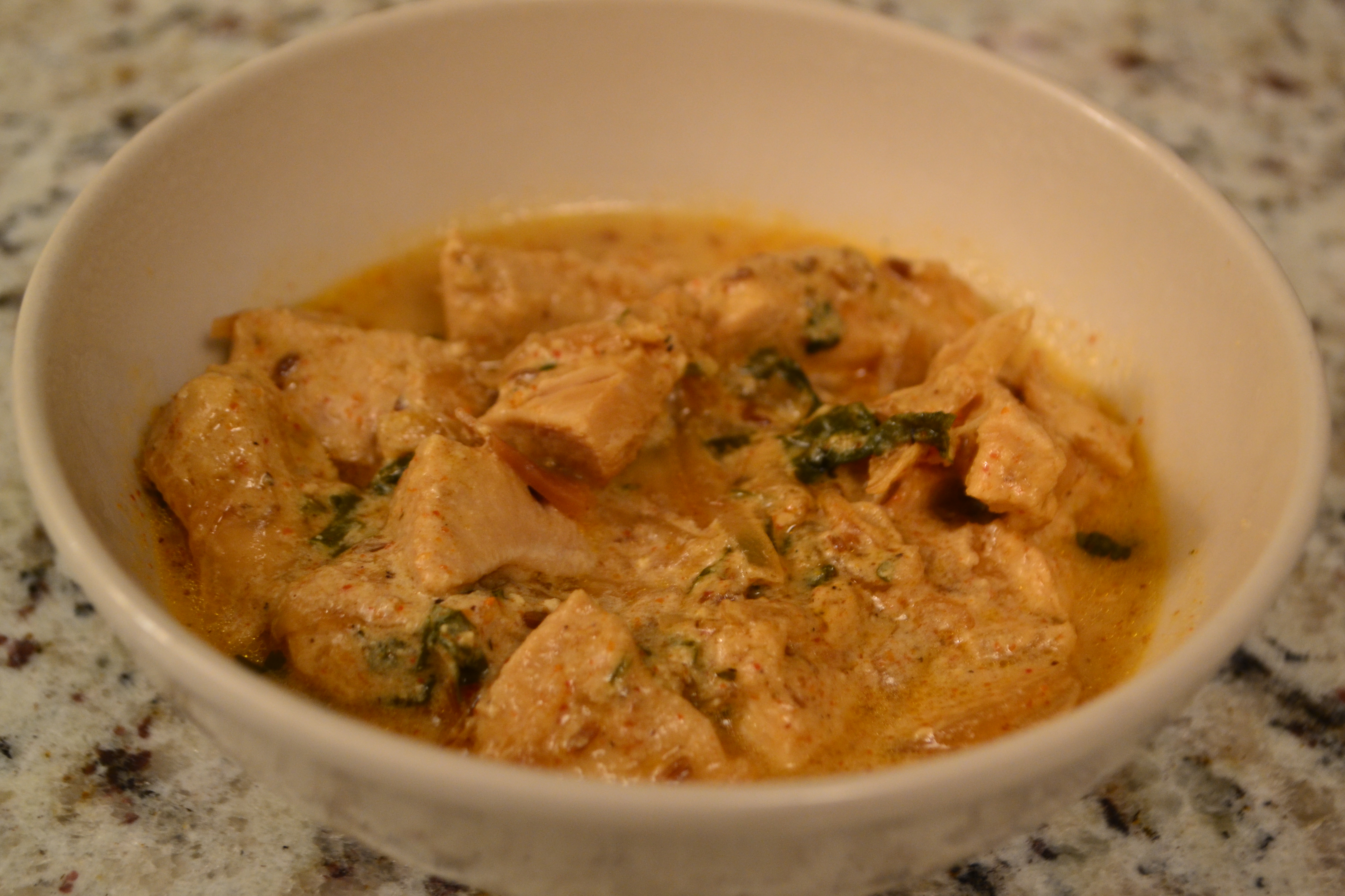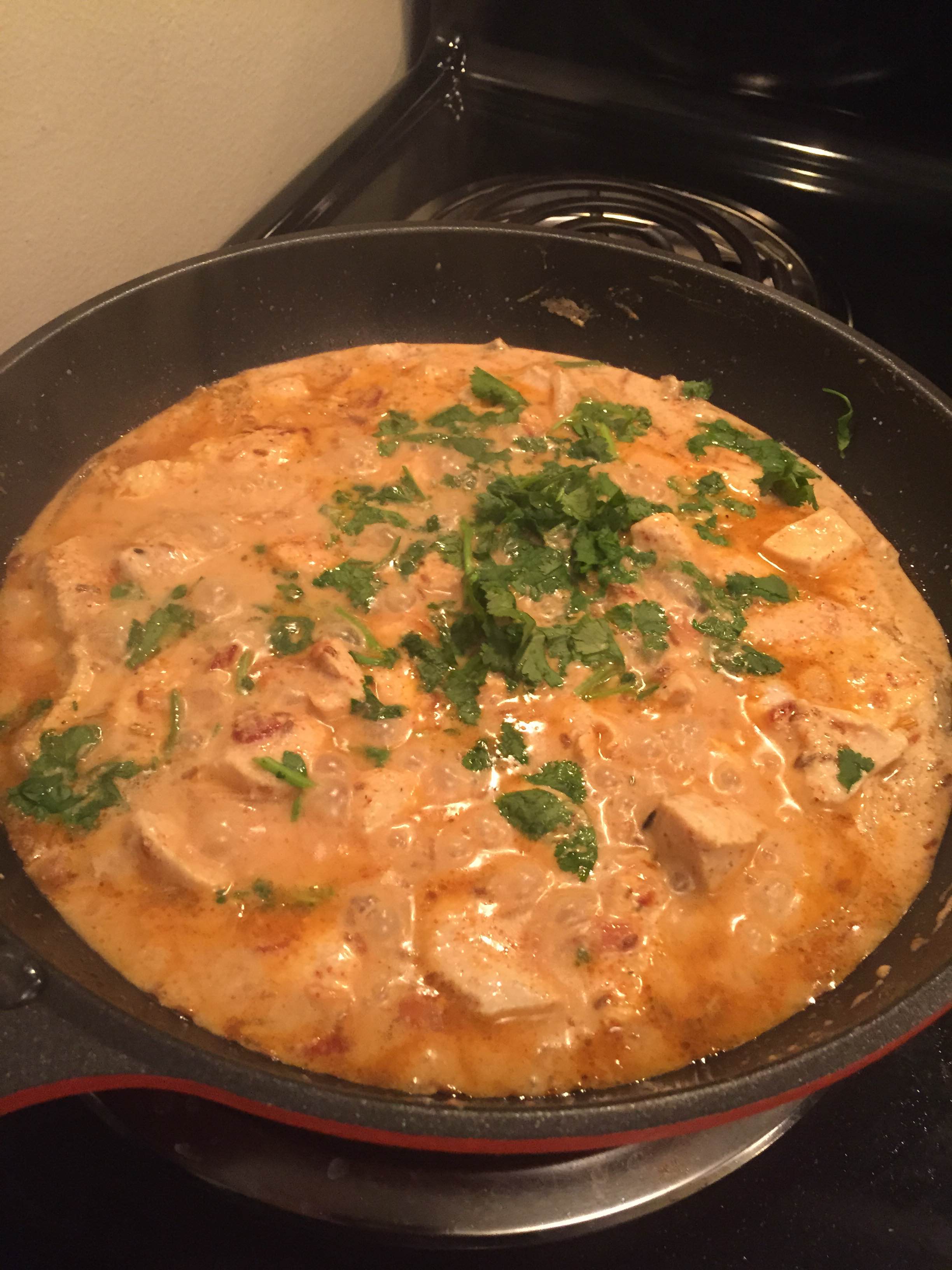 • Check to see if the chicken is cooked. Turn off heat, add the chopped cilantro, mix well and let the curry sit in the pan with the lid on for about 5 more minutes.
