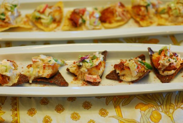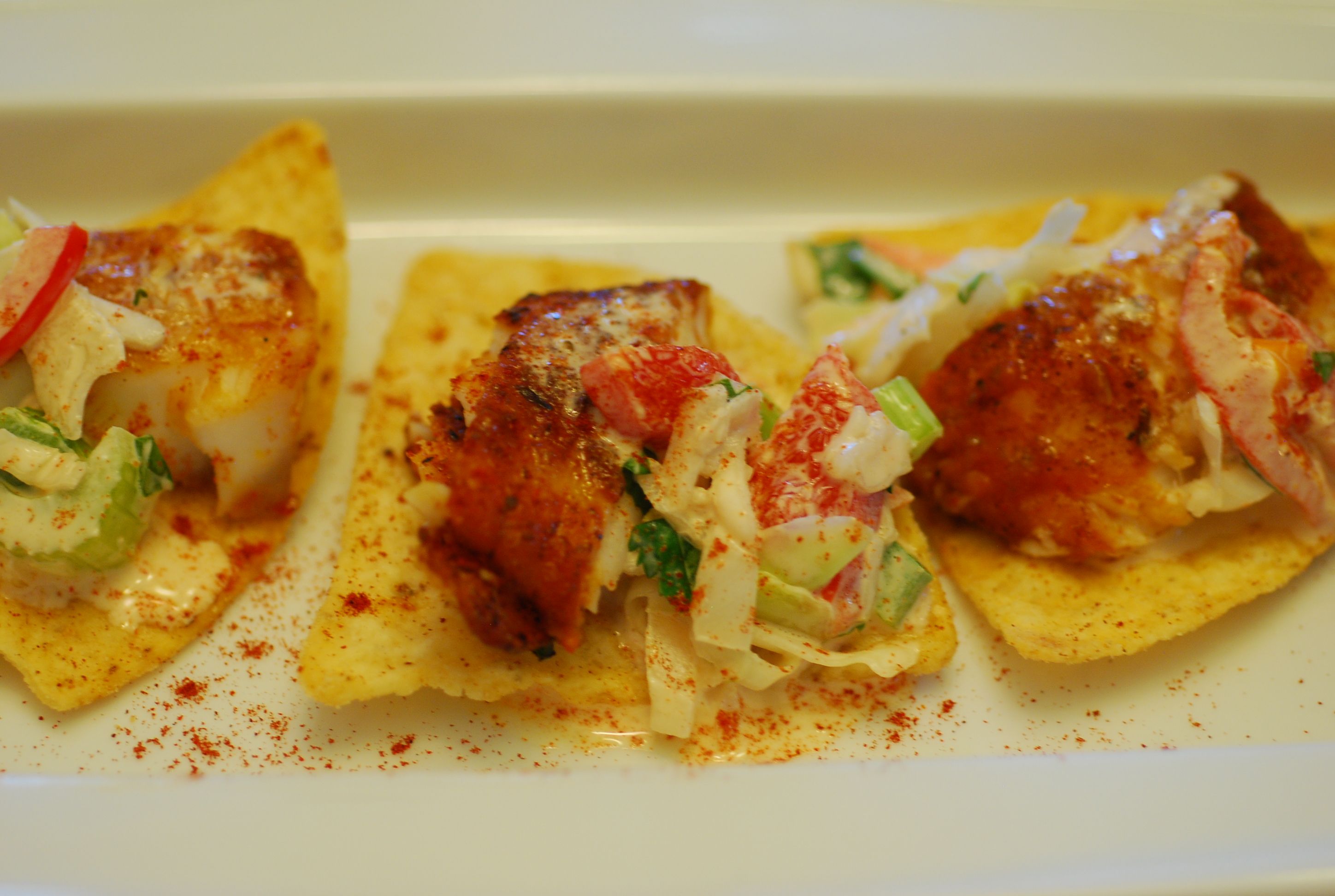 - Alternatively as a fun appetizer, you could spoon some guacamole in the center of a taco chip (I bought the triangular large chips), then the cilantro sauce, place a small piece of the fish on top, top with slaw. You don’t need the cheese or tomatoes.